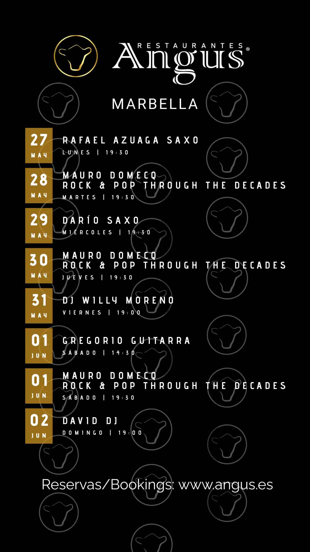 Aquí está nuestra nueva programación musical para esta semana. ¿Buscas los mejores filetes y cócteles de Marbella? No busque más allá de ANGUS. Estamos abiertos 7 días a la semana, con música en vivo y DJs durante toda la semana. Traiga a toda la familia para una experiencia gastronómica inolvidable.