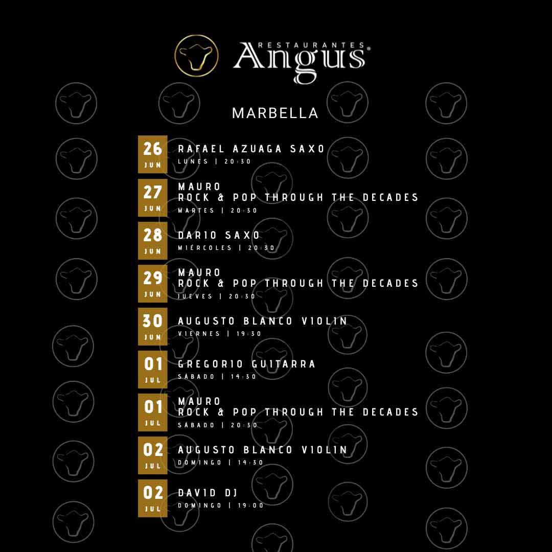 ¡Únete a nosotros en ANGUS Marbella para una experiencia gastronómica inolvidable llena de la magia de la música en directo! Estamos encantados de anunciar que tenemos actuaciones en nuestro restaurante todos los días.