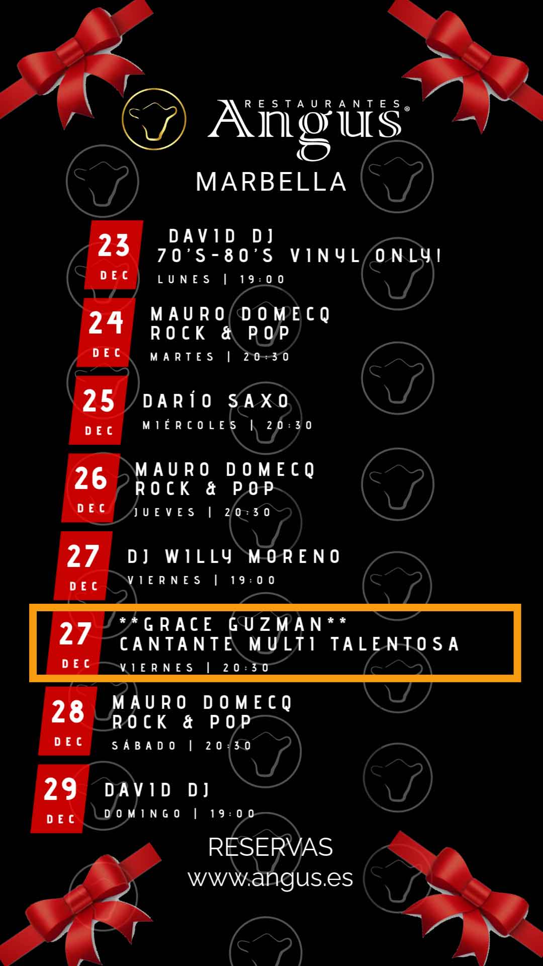 El 27 de diciembre a las 20:30h, tendremos una increíble actuación en directo de la talentosa Grace Guzman. Conocida por su energía cautivadora y su potente voz, Grace hará que su velada sea inolvidable.