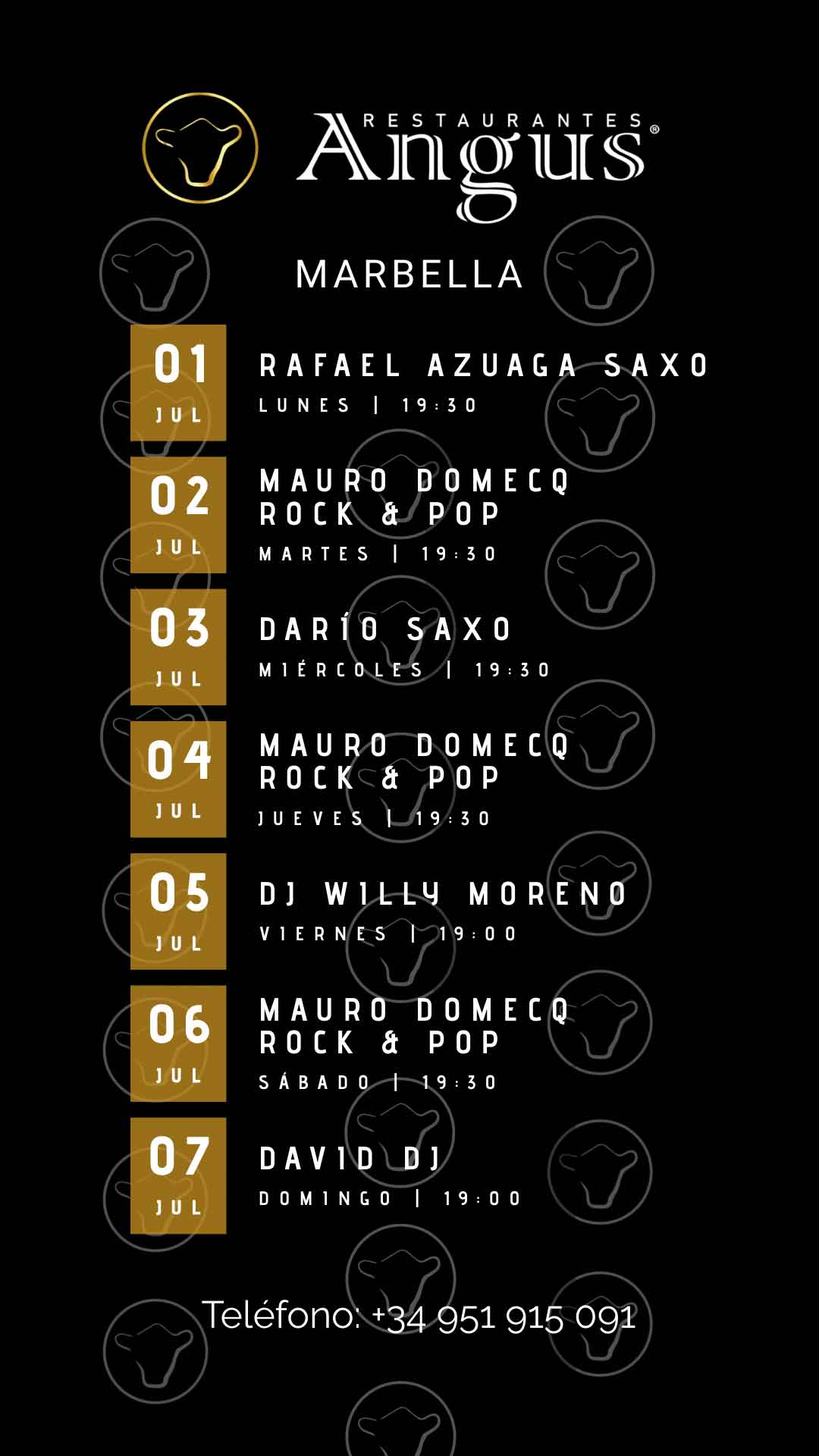 En ANGUS, estamos listos para hacer que sus noches de verano especial con nuestro ambiente familiar y música en vivo en nuestra Playamar, Marbella, y Puerto Marina lugares.
